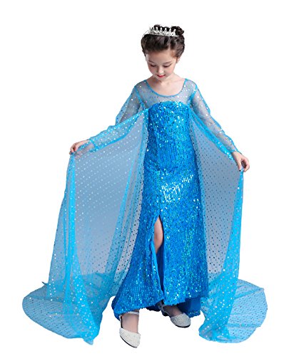 Click for More Images Stunning snow queen inspired costume dress up with train for little girls! A shiny ball gown makes your little one become the most eye-catching ice princess at the party!Glowing floor length dress with sweep train all over...